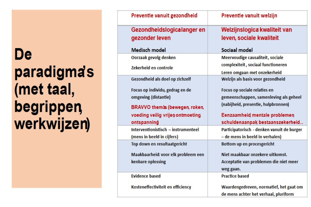 “Het schema met de eigenschappen van de gezondheidslogica (medisch model) naast die van welzijnslogica (sociaal model) zorgt vrijwel altijd voor een aha-erlebnis. Mensen snappen ineens waarom de samenwerking tussen zorg en welzijn vaak stroef gaat. Andere wereld, andere taal. Van veel toehoorders kreeg ik dus ook de vraag of ik mijn verhaal verder kon verspreiden, liefst bij hun zorgorganisatie.”